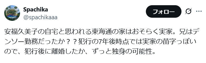 安福久美子容疑者が4人家族とする情報は警察や報道機関による公式文書や会見など、明確な発表は現時点で確認されていません。