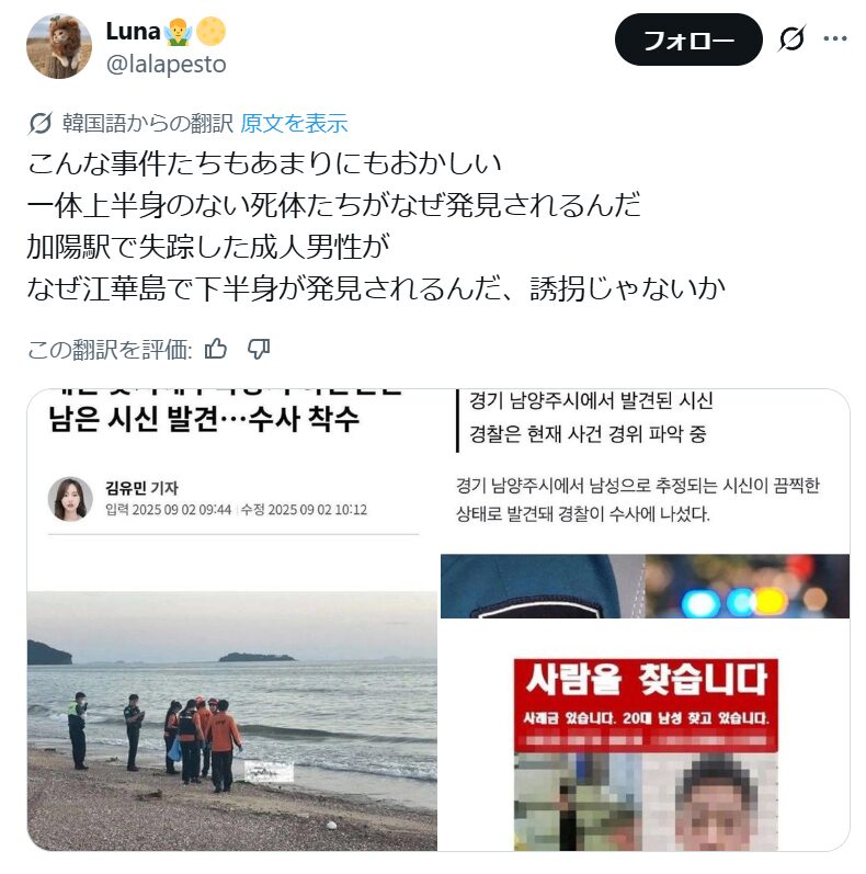 SNSを調べてみたところ、2025年9月ごろに江華島で下半身が発見されたという報道は存在します。