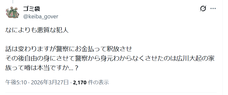 一方、ネット上では広川大起容疑者の家族への関心が非常に高まっています。